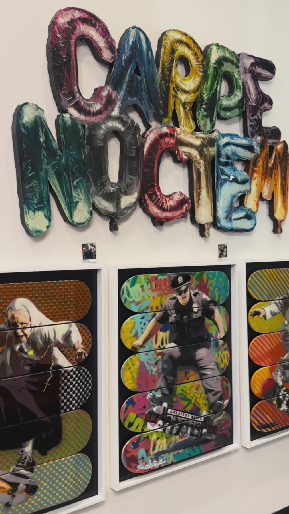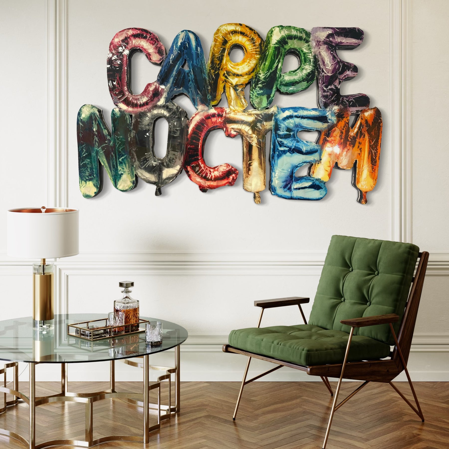 Carpe Noctem — Latin for “Seize the Night” — is a bold, vibrant artwork that transforms a timeless phrase into a street-inspired statement piece. Spray painted on wood, finished with a high-gloss resin, and mounted on foam, each balloon-style letter bursts with color and shine, capturing the energy of nightlife and the spirit of living in the moment.