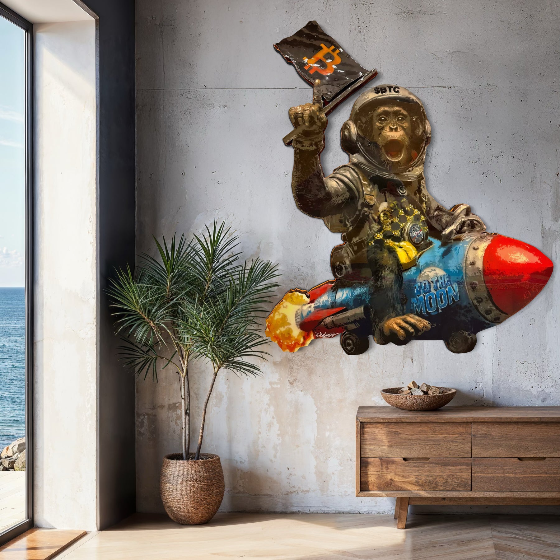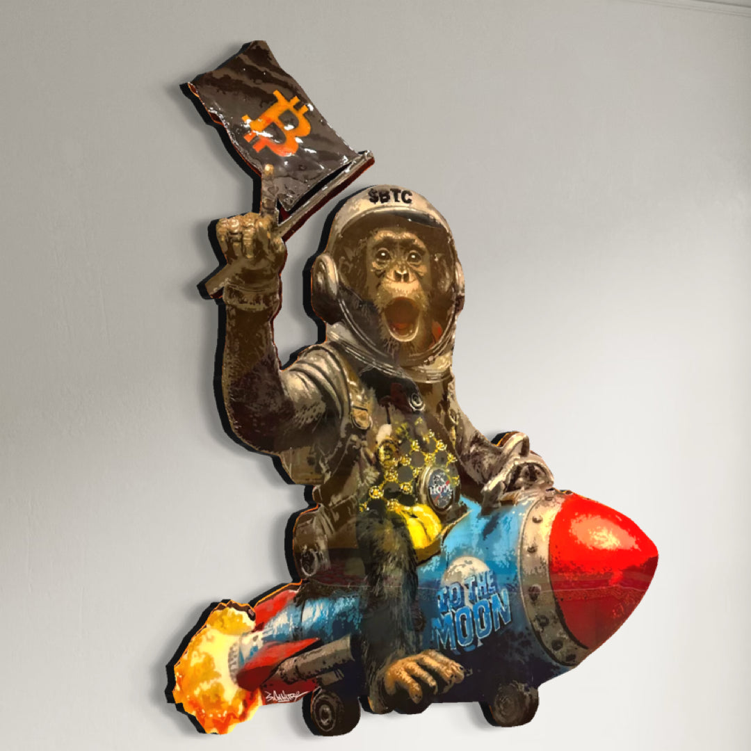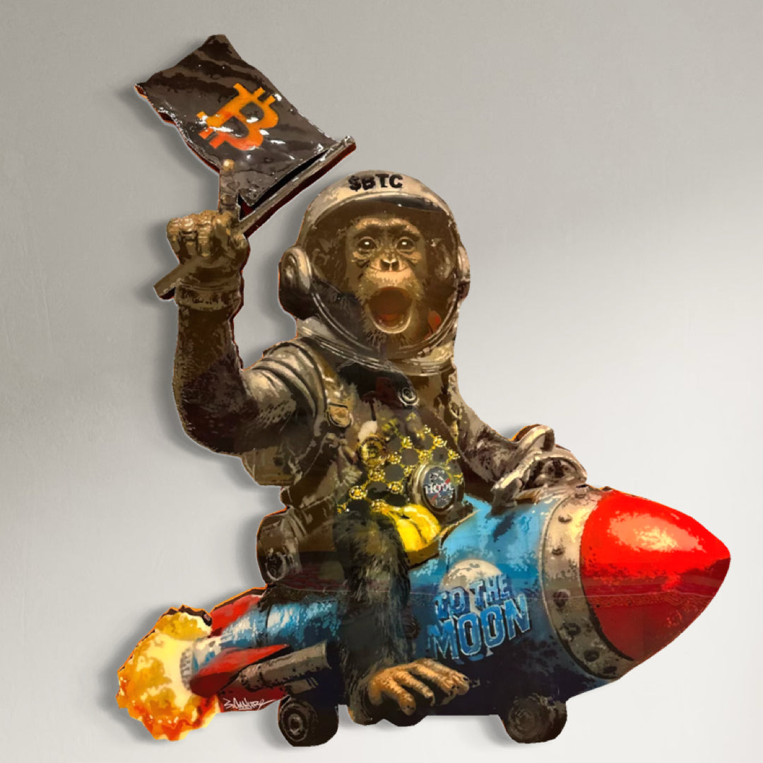 Own a bold statement piece that fuses pop culture, crypto enthusiasm, and contemporary street art. “To The Moon” is a one-of-a-kind original painting by Spencer Couture, featuring a chimp astronaut gripping a Bitcoin flag and blasting off on a rocket — the ultimate symbol of crypto’s rise.